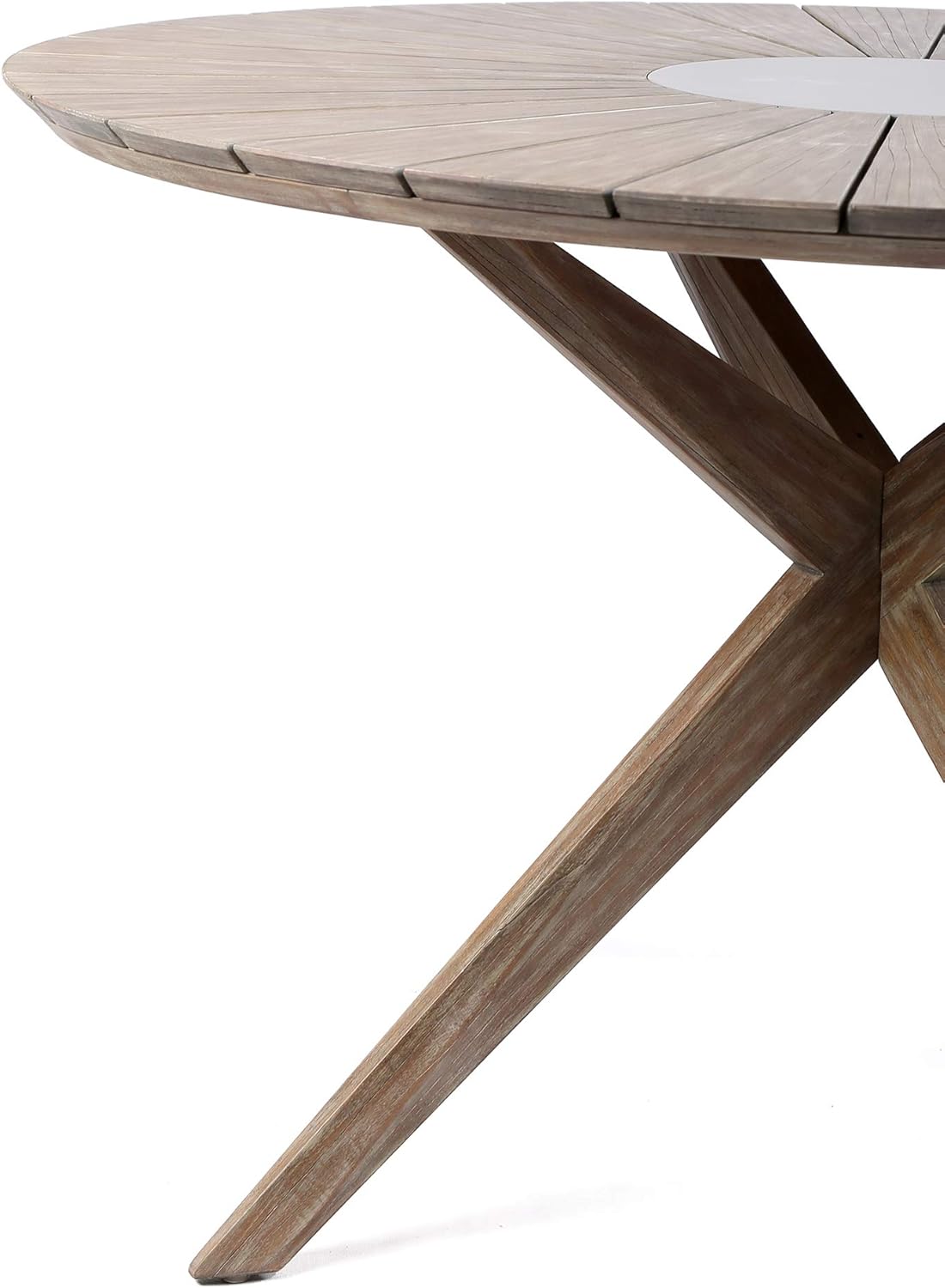 - Premium Teak Wood Table: The centerpiece is a stylish round dining table crafted from high-quality teak wood. Known for its exceptional durability, weather resistance, and beautiful natural grain, teak develops a desirable silvery-gray patina over time when left outdoors. The unique pedestal-style base maximizes legroom.