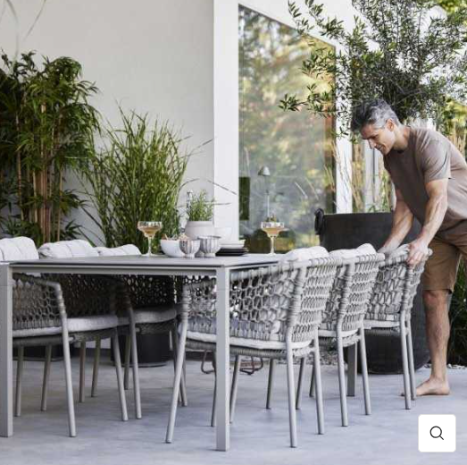 6 Contemporary Woven Rope Chairs: This set includes six comfortable armchairs with a distinctive dark grey/black woven rope design over sturdy metal frames. The intricate weave adds texture and visual interest, while the high-quality synthetic rope ensures durability and resistance to outdoor elements.