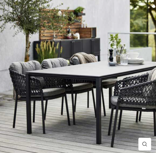 Sleek Rectangular Dining Table: The centerpiece is a stylish, generously sized rectangular dining table featuring a dark gray/anthracite tabletop (likely made from a durable composite, HPL, or treated metal) and a matching powder-coated metal frame. Its clean lines and minimalist design provide a modern foundation for your outdoor space.