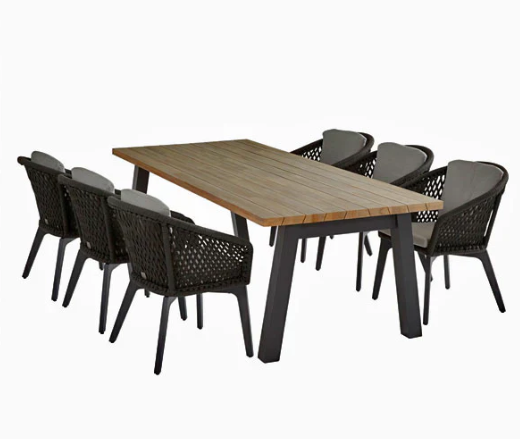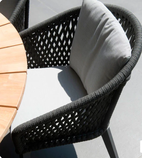 6 Luxurious Woven Rope Chairs: This set includes six elegant armchairs, featuring a stylish dark grey/charcoal woven rope design over sturdy frames. The rope is a durable, weather-resistant synthetic material, offering both sophisticated texture and comfortable support, while the light grey cushions (often included) provide plush seating.