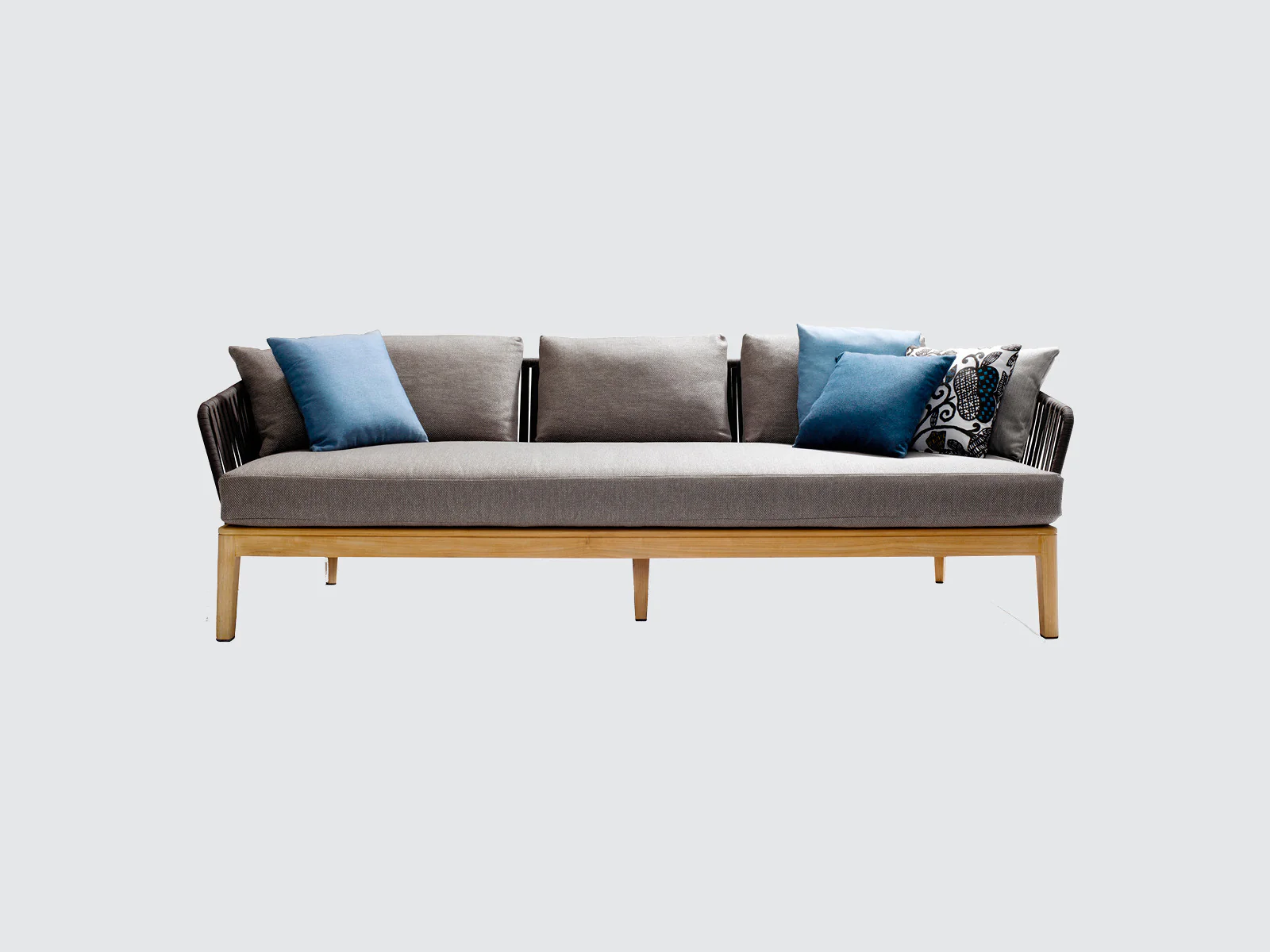 Elegant Modern Design: Beautifully crafted outdoor sofa set combining natural wood with contemporary rope weaving for a sophisticated look.